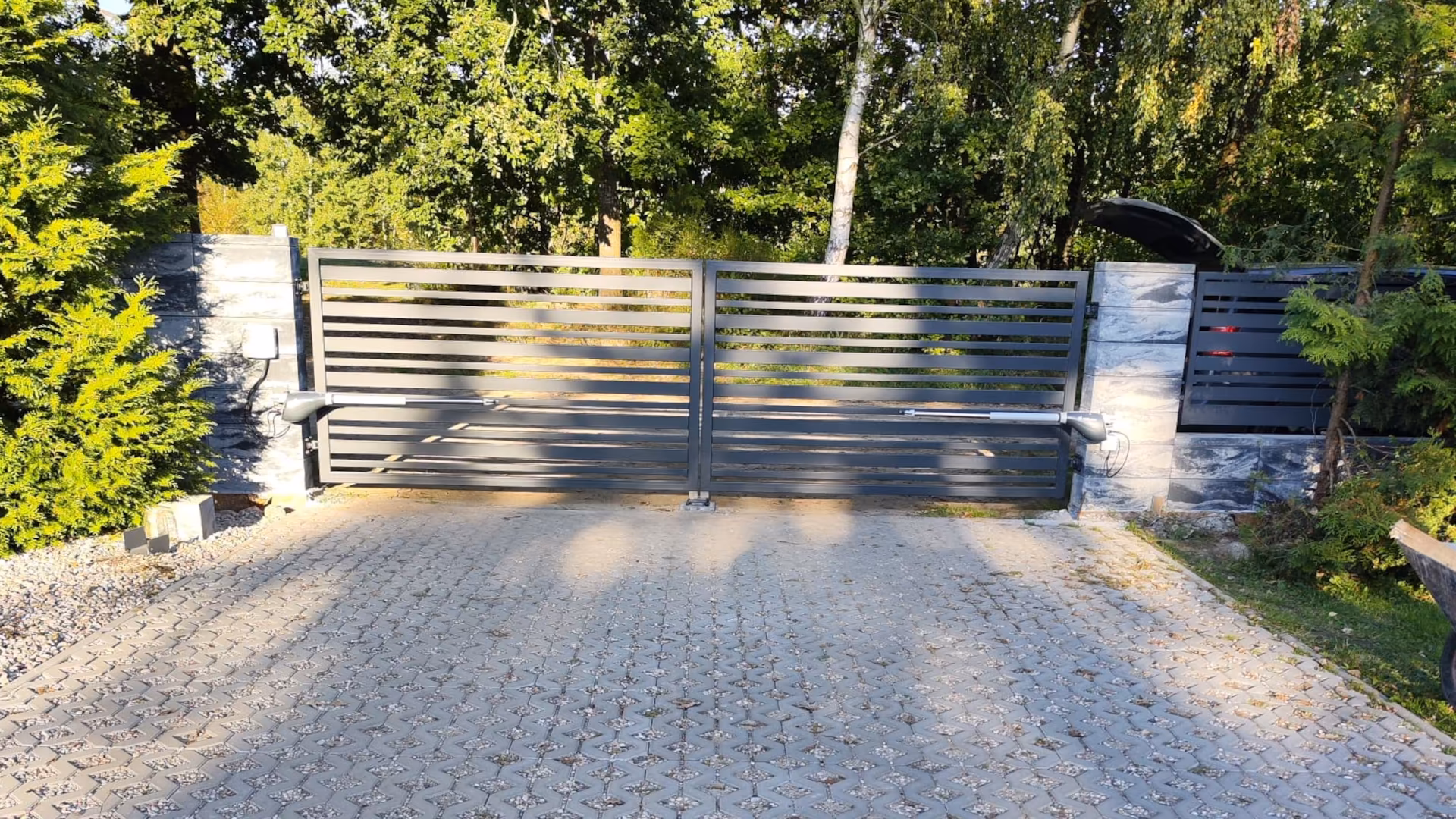 Napędy do bram dwuskrzydłowych napęd do bramy skrzydłowej V2 Calypso zamontowany przy nowoczesnej bramie wjazdowej